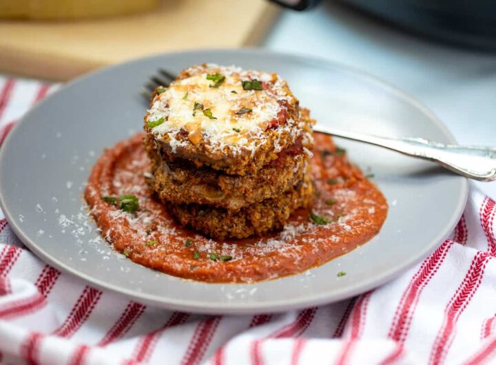 Nulupkite baklažanus ir supjaustykite ½ colio storio griežinėliais. Supjaustytus baklažanus padėkite ant grotelių ant kepimo skardos ir...
