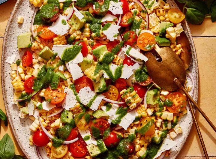Mūsų vasaros kukurūzų salotose yra pūslių kukurūzai, sultingi vyšniniai pomidorai, kreminis avokadas ir lašelis aštraus bazilikų vinaigreto....