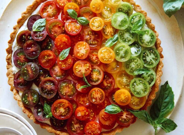Skanus receptas stulbinančiai Heirloom Pomidorų tortui su sviestine plutele, plakto ožkos sūrio įdaru ir sultingais paveldėtais vyšniniais...