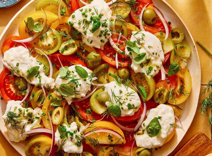 Šviežios ir energingos pomidorų salotos su sultingais paveldėtais pomidorais, kremine burrata ir aštriu citrinų ir žolelių vinigretu...